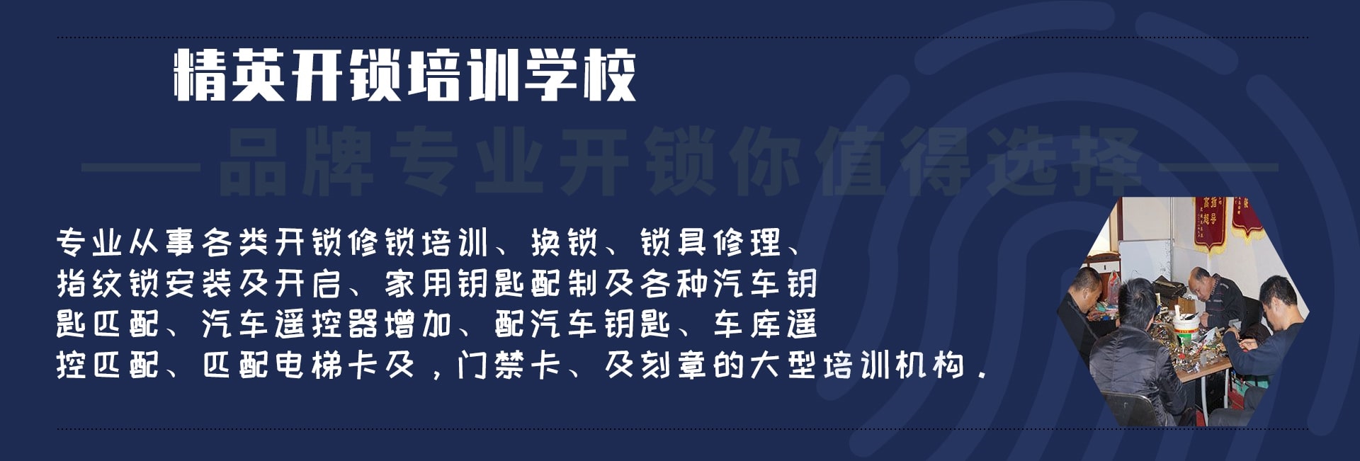 S精英開鎖培訓(xùn)學(xué)校 歡迎參觀薊縣開鎖培訓(xùn)學(xué)校網(wǎng)站!我們是正規(guī)開鎖培訓(xùn)學(xué)校,是經(jīng)工商注冊備案. 經(jīng)勞動部門批準面向全國招生,提供開鎖技術(shù)培訓(xùn),本技校成立以來,本著“誠信,良心,用心”的原則方針。先后培育了全國各地有突出貢獻的優(yōu)秀鎖匠,培育優(yōu)秀道德鎖匠。本校主要從事開鎖學(xué)校培訓(xùn)、開鎖技術(shù)培訓(xùn)、薊州開鎖培訓(xùn)班、汽車開鎖學(xué)校等培訓(xùn),本校才用1對1教學(xué),奉客戶為上帝的原則去教學(xué),精英開鎖技術(shù)學(xué)校設(shè)有專業(yè)的教室,完善的設(shè)備,本技校有技術(shù)老師8名,設(shè)有直營店面3家,學(xué)員畢業(yè)經(jīng)技術(shù)堅定部門合格,發(fā)職業(yè)資格證書(鎖具修理工)全國通用。